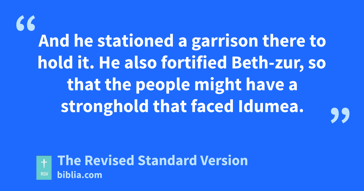 60 At that time they fortified Mount Zion with high walls and strong towers round about, to keep the Gentiles from coming and trampling them down as they had done before. 61 And he stationed a garrison there to hold it. He also fortified Beth-zur, so that the people might have a stronghold that faced Idumea.