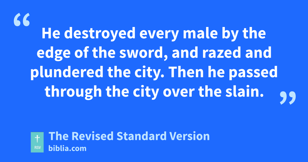 45 Then Judas gathered together all the Israelites in Gilead, the small and the great, with their wives and children and goods, a very large company, to go to the land of Judah. 46 So they came to Ephron. This was a large and very strong city on the road, and they could not go round it to the right or to the left; they had to go through it. 47 But the men of the city shut them out and blocked up the gates with stones. 48 And Judas sent them this friendly message, “Let us pass through your land to get to our land. No one will do you harm; we will simply pass by on foot.” But they refused to open to him. 49 Then Judas ordered proclamation to be made to the army that each should encamp where he was. 50 So the men of the forces encamped, and he fought against the city all that day and all the night, and the city was delivered into his hands. 51 He destroyed every male by the edge of the sword, and razed and plundered the city. Then he passed through the city over the slain.