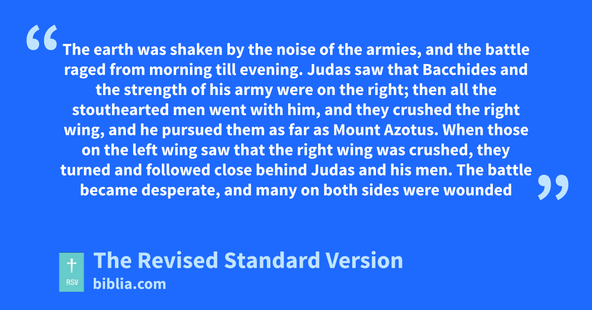 14 Judas saw that Bacchides and the strength of his army were on the right; then all the stouthearted men went with him, 15 and they crushed the right wing, and he pursued them as far as Mount Azotus. 16 When those on the left wing saw that the right wing was crushed, they turned and followed close behind Judas and his men. 17 The battle became desperate, and many on both sides were wounded and fell. 18 Judas also fell, and the rest fled.