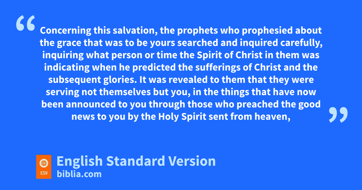 10 Concerning this salvation, xthe prophets who prophesied about the grace that was to be yours searched and inquired carefully, 11 inquiring ywhat person or time1 zthe Spirit of Christ in them was indicating awhen he predicted bthe sufferings of Christ and the subsequent glories. 12 cIt was revealed to them that dthey were serving not themselves but you, in the things that have now been announced to you through those who preached the good news to you eby the Holy Spirit sent from heaven, fthings into which angels long to look.