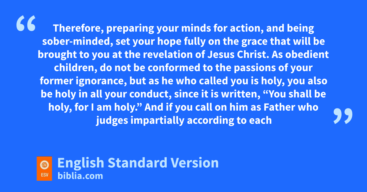 13 Therefore, gpreparing your minds for action,2 and hbeing sober-minded, set your hope fully on the grace that will be brought to you at the revelation of Jesus Christ. 14 As obedient children, ido not be conformed to the passions jof your former ignorance, 15 but kas he who called you is holy, you also be holy lin all your conduct, 16 since it is written, m“You shall be holy, for I am holy.” 17 And if you ncall on him as Father who ojudges pimpartially according to each one’s deeds, conduct yourselves qwith fear throughout the time of your exile, 18 knowing that you rwere ransomed from sthe futile ways inherited from your forefathers, not with perishable things such as silver or gold, 19 but twith the precious blood of Christ, like that of ua lamb vwithout blemish or spot. 20 He was foreknown before the foundation of the world but wwas made manifest xin the last times for the sake of you 21 ywho through him are believers in God, zwho raised him from the dead and agave him glory, so that your faith and hope are in God.