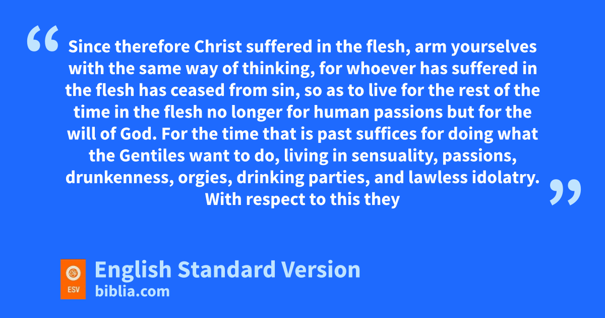 4 Since therefore zChrist suffered in the flesh,1 aarm yourselves with the same way of thinking, for bwhoever has suffered in the flesh chas ceased from sin, 2 dso as to live for ethe rest of the time in the flesh fno longer for human passions but gfor the will of God. 3 For the time that is past hsuffices ifor doing what the Gentiles want to do, living in sensuality, passions, drunkenness, orgies, drinking parties, and lawless idolatry. 4 With respect to this they are surprised when you do not join them in the same flood of jdebauchery, and kthey malign you; 5 but they will give account to him who is ready lto judge the living and the dead. 6 For this is why mthe gospel was preached even to those who are dead, that though judged in the flesh the way people are, they might live in the spirit the way God does.