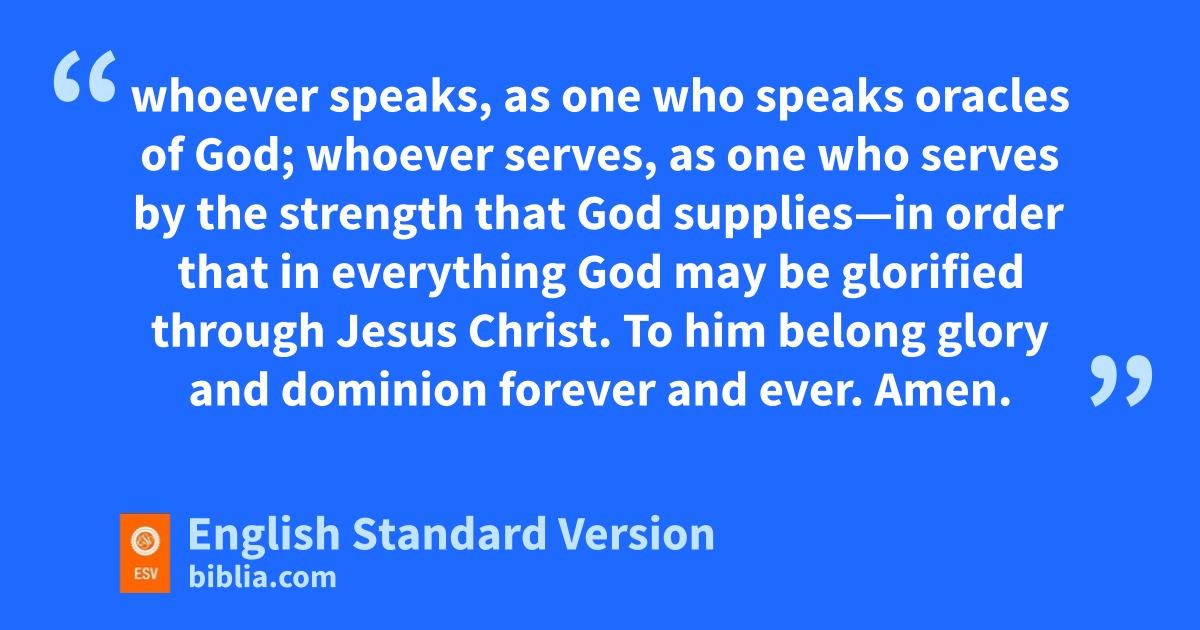 7 nThe end of all things is at hand; therefore obe self-controlled and sober-minded pfor the sake of your prayers. 8 Above all, keep loving one another earnestly, since qlove covers a multitude of sins. 9 rShow hospitality to one another without grumbling. 10 sAs each has received a gift, use it to serve one another, tas good stewards of God’s varied grace: 11 whoever speaks, as one who speaks uoracles of God; whoever serves, as one who serves vby the strength that God supplies—in order that in everything wGod may be glorified through Jesus Christ. xTo him belong glory and ydominion forever and ever. Amen.