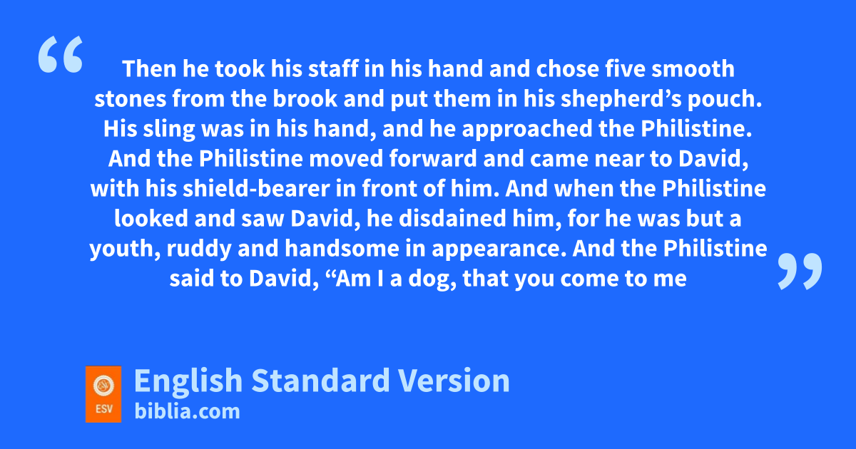 41 And the Philistine moved forward and came near to David, hwith his shield-bearer in front of him. 42 And when the Philistine looked and saw David, he disdained him, for he was but a youth, iruddy and handsome in appearance. 43 And the Philistine said to David, “Am I ja dog, that you come to me with sticks?” And the Philistine cursed David by his gods. 44 The Philistine said to David, “Come to me, and I will give your flesh kto the birds of the air and to the beasts of the field.” 45 Then David said to the Philistine, “You come to me with a sword and with a spear and with la javelin, but I come to you in the name of the Lord of hosts, the God of the armies of Israel, ewhom you have defied. 46 This day the Lord will deliver you into my hand, and I will strike you down and cut off your head. mAnd I will give the dead bodies of the host of the Philistines this day nto the birds of the air and to the wild beasts of the earth, othat all the earth may know that there is a God in Israel, 47 and that all this assembly may know that pthe Lord saves not with sword and spear. qFor the battle is the Lord’s, and he will give you into our hand.”