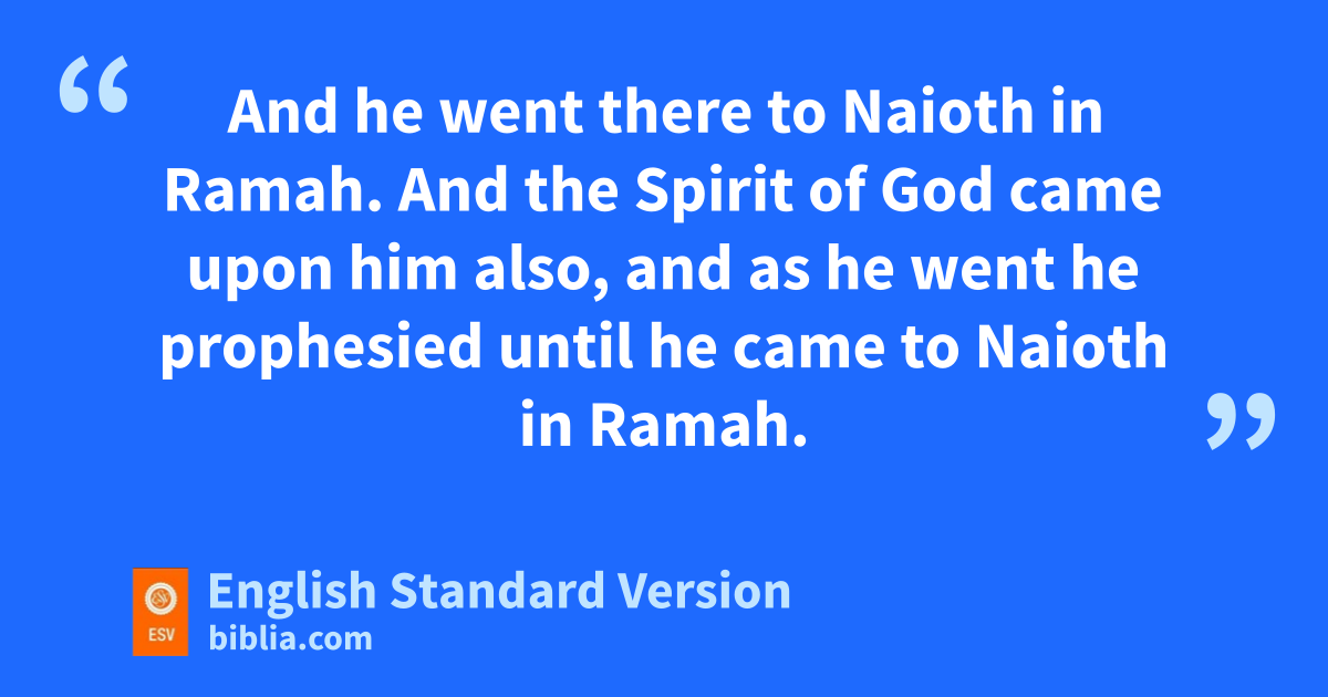 18 Now David fled and escaped, and he came to Samuel at gRamah and told him all that Saul had done to him. And he and Samuel went and lived at Naioth. 19 And it was told Saul, “Behold, David is at Naioth in Ramah.” 20 Then Saul sent messengers to take David, and when they saw the company of the prophets prophesying, and Samuel standing as head over them, hthe Spirit of God came upon the messengers of Saul, iand they also prophesied. 21 When it was told Saul, he sent other messengers, iand they also prophesied. And Saul sent messengers again the third time, iand they also prophesied. 22 Then he himself went to Ramah and came to the great well that is in Secu. And he asked, “Where are Samuel and David?” And one said, “Behold, they are at Naioth in gRamah.” 23 And he went there to Naioth in Ramah. jAnd the Spirit of God came upon him also, and as he went he prophesied until he came to Naioth in Ramah. 24 kAnd he too stripped off his clothes, and he too prophesied before Samuel and lay naked all that day and all that night. Thus it is said, l“Is Saul also among the prophets?”