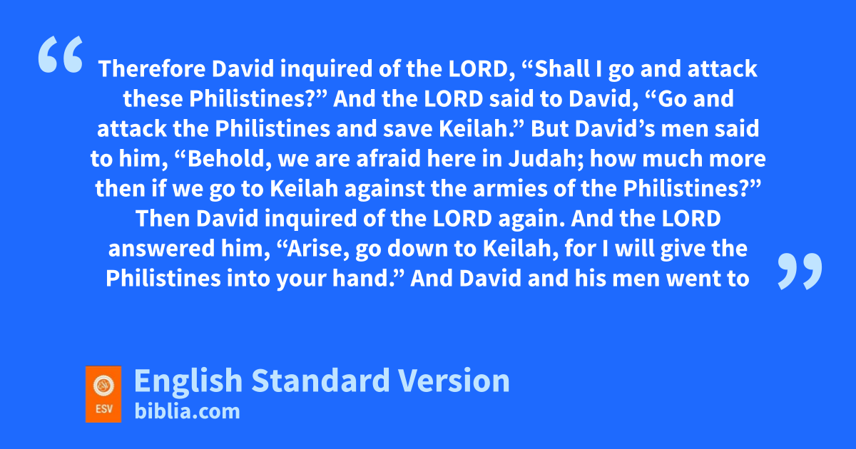 23 Now they told David, “Behold, the Philistines are fighting against eKeilah and are robbing the threshing floors.” 2 Therefore David finquired of the Lord, “Shall I go and attack these Philistines?” And the Lord said to David, “Go and attack the Philistines and save Keilah.” 3 But David’s men said to him, “Behold, we are afraid here in Judah; how much more then if we go to Keilah against the armies of the Philistines?” 4 Then David finquired of the Lord again. And the Lord answered him, “Arise, go down to Keilah, gfor I will give the Philistines into your hand.” 5 And David and his men went to Keilah and fought with the Philistines and brought away their livestock and struck them with a great blow. So David saved the inhabitants of Keilah.