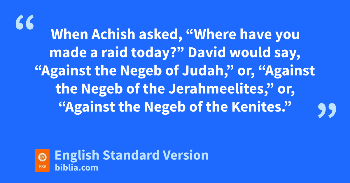 8 Now David aand his men went up and made raids against bthe Geshurites, cthe Girzites, and dthe Amalekites, for these were the inhabitants of the land from of old, eas far as Shur, to the land of Egypt. 9 And David would strike the land and would leave neither man nor woman alive, but would take away the sheep, the oxen, the donkeys, the camels, and the garments, and come back to Achish. 10 When Achish asked, “Where have you fmade a raid today?” David would say, “Against the Negeb of Judah,” or, “Against the Negeb of gthe Jerahmeelites,” or, “Against the Negeb of hthe Kenites.” 11 And David would leave neither man nor woman alive to bring news to Gath, thinking, “lest they should tell about us and say, ‘So David has done.’ ” Such was his custom all the while he lived in the country of the Philistines. 12 And Achish trusted David, thinking, “He has made himself an utter stench to his people Israel; therefore he shall always be my servant.”