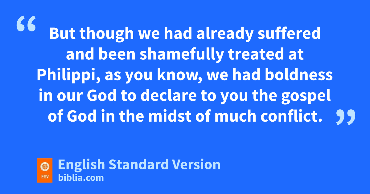 2 For you yourselves know, brothers,1 that our fcoming to you gwas not in vain. 2 But though we had already suffered and been shamefully treated hat Philippi, as you know, iwe had boldness in our God jto declare to you the gospel of God in the midst of much kconflict. 3 For lour appeal does not spring from merror or nimpurity or oany attempt to deceive, 4 but just as we have been approved by God pto be entrusted with the gospel, so we speak, not qto please man, but to please God rwho tests our hearts. 5 sFor we never came with words of flattery,2 as you know, nor with a pretext for greed—tGod is witness. 6 uNor did we seek glory from people, whether from you or from others, vthough we could have made wdemands as xapostles of Christ. 7 But we were ygentle3 among you, zlike a nursing mother taking care of her own children. 8 So, being affectionately desirous of you, we were ready to share with you not only the gospel of God abut also our own selves, because you had become very dear to us.