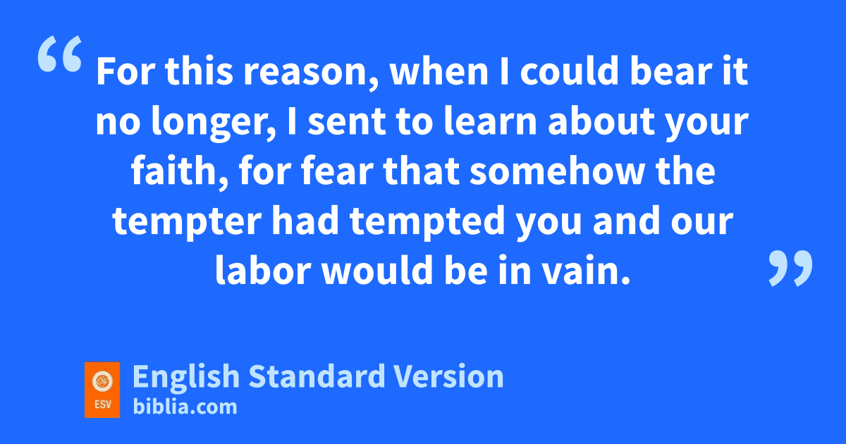3 Therefore when we could bear it no longer, we were willing dto be left behind at Athens alone, 2 and we esent Timothy, four brother and God’s coworker1 in the gospel of Christ, to establish and exhort you in your faith, 3 that no one be moved by these afflictions. For you yourselves know that gwe are destined for this. 4 For when we were with you, we kept telling you beforehand that we were to suffer affliction, hjust as it has come to pass, and just as you know. 5 For this reason, iwhen I could bear it no longer, iI sent to learn about your faith, jfor fear that somehow kthe tempter had tempted you and lour labor would be in vain.