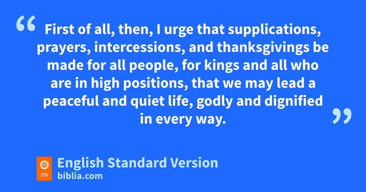 2 First of all, then, I urge that supplications, prayers, intercessions, and thanksgivings be made for all people, 2 vfor kings and all who are in high positions, that we may lead a peaceful and quiet life, godly and wdignified in every way. 3 This is good, and xit is pleasing in the sight of yGod our Savior, 4 who desires zall people to be saved and ato come to bthe knowledge of the truth. 5 For cthere is one God, and there is one mediator between God and men, the man1 Christ Jesus, 6 dwho gave himself as a ransom for all, which is ethe testimony given fat the proper time. 7 gFor this I was appointed a preacher and an apostle (hI am telling the truth, I am not lying), ia teacher of the Gentiles in faith and truth.