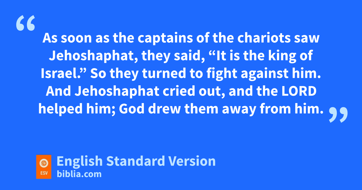 28 So the king of Israel and Jehoshaphat the king of Judah went up to Ramoth-gilead. 29 And the king of Israel said to Jehoshaphat, “I will disguise myself and go into battle, but you wear your robes.” And the king of Israel disguised himself, and they went into battle. 30 Now the king of Syria had commanded the captains of his chariots, “Fight with neither small nor great, but only with the king of Israel.” 31 As soon as the captains of the chariots saw Jehoshaphat, they said, “It is the king of Israel.” So they turned to fight against him. And Jehoshaphat cried out, and the Lord helped him; God drew them away from him. 32 For as soon as the captains of the chariots saw that it was not the king of Israel, they turned back from pursuing him. 33 But a certain man drew his bow at random1 and struck the king of Israel between the scale armor and the breastplate. Therefore he said to the driver of his chariot, “Turn around and carry me out of the battle, for I am wounded.” 34 And the battle continued that day, and the king of Israel was propped up in his chariot facing the Syrians until evening. Then at sunset he died.