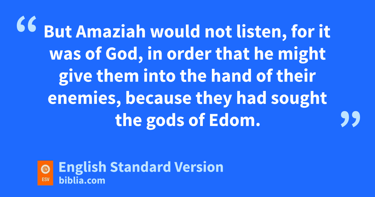 14 After Amaziah came from striking down the Edomites, the brought the gods rof the men of Seir and set them up as his gods and worshiped them, making offerings to them. 15 Therefore the Lord was angry with Amaziah and sent to him a prophet, who said to him, “Why have you sought the gods of a people uwho did not deliver their own people from your hand?” 16 But as he was speaking, the king said to him, “Have we made you a royal counselor? Stop! Why should you be struck down?” So the prophet stopped, but said, “I know that vGod has determined to destroy you, because you have done this and have not listened to my counsel.”