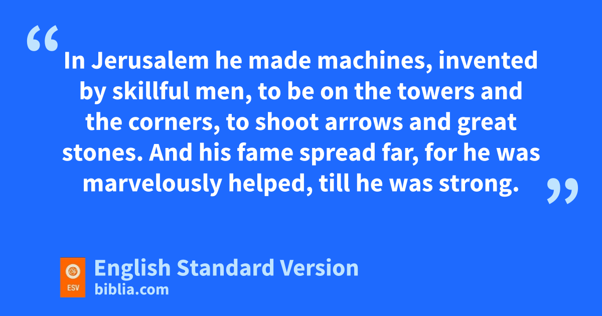 6 He went out and hmade war against the Philistines and broke through the wall of Gath and the wall of Jabneh and the wall of Ashdod, and he built cities in the territory of Ashdod and elsewhere among the Philistines. 7 God helped him iagainst the Philistines and against the Arabians who lived in Gurbaal and against the jMeunites. 8 The Ammonites kpaid tribute to Uzziah, and his fame spread even to the border of Egypt, for he became very strong. 9 Moreover, Uzziah built towers in Jerusalem at lthe Corner Gate and at mthe Valley Gate and at nthe Angle, and fortified them. 10 And he built towers in the wilderness and ocut out many cisterns, for he had large herds, both in the Shephelah and in the plain, and he had farmers and vinedressers in the hills and in the fertile lands, for he loved the soil. 11 Moreover, Uzziah had an army of soldiers, fit for war, in divisions according to the numbers in the muster made by Jeiel the secretary and Maaseiah the officer, under the direction of Hananiah, one of the king’s commanders. 12 The whole number of the heads of fathers’ houses of mighty men of valor was 2,600. 13 Under their command was an army of p307,500, who could make war with mighty power, to help the king against the enemy. 14 And Uzziah prepared for all the army shields, spears, helmets, qcoats of mail, bows, and stones for slinging. 15 In Jerusalem he made machines, invented by skillful men, to be on the towers and the corners, to shoot arrows and great stones. And his fame spread far, for he was marvelously helped, till he was strong.