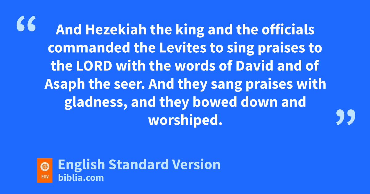 25 mAnd he stationed the Levites in the house of the Lord with cymbals, harps, and lyres, naccording to the commandment of David and of Gad othe king’s seer and of pNathan the prophet, for the commandment was from the Lord through his prophets. 26 The Levites stood with qthe instruments of David, rand the priests with the trumpets. 27 Then Hezekiah commanded that the burnt offering be offered on the altar. And when the burnt offering began, sthe song to the Lord began also, and the trumpets, accompanied by the instruments of David king of Israel. 28 The whole assembly worshiped, and the singers sang, and the trumpeters sounded. All this continued until the burnt offering was finished. 29 When the offering was finished, tthe king and all who were present with him bowed themselves and worshiped. 30 And Hezekiah the king and the officials commanded the Levites to sing praises to the Lord with the words of David and of Asaph the seer. And they sang praises with gladness, and they bowed down and worshiped.