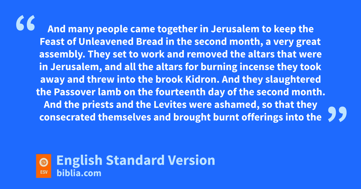13 And many people came together in Jerusalem to keep the Feast of Unleavened Bread rin the second month, a very great assembly. 14 They set to work and removed sthe altars that were in Jerusalem, and all the altars for burning incense they took away tand threw into the brook Kidron. 15 uAnd they slaughtered the Passover lamb on the fourteenth day of the second month. vAnd the priests and the Levites were ashamed, wso that they consecrated themselves and brought burnt offerings into the house of the Lord. 16 xThey took their accustomed posts according to the Law of Moses ythe man of God. The priests threw the blood that they received from the hand of the Levites. 17 For there were many in the assembly who had not consecrated themselves. Therefore the Levites had to slaughter the Passover lamb for everyone who was not clean, to consecrate it to the Lord. 18 For a majority of the people, zmany of them from Ephraim, Manasseh, Issachar, and Zebulun, had not cleansed themselves, yet they ate the Passover otherwise athan as prescribed. For Hezekiah had prayed for them, saying, “May the good Lord pardon everyone 19 bwho sets his heart to seek God, the Lord, the God of his fathers, even though not according to the sanctuary’s rules of cleanness.”1 20 And the Lord heard Hezekiah and healed the people. 21 And the people of Israel who were present at Jerusalem kept cthe Feast of Unleavened Bread seven days with great gladness, and the Levites and the priests praised the Lord day by day, singing with all their might2 to the Lord. 22 And Hezekiah spoke dencouragingly to all the Levites who showed good skill in the service of the Lord. So they ate the food of the festival for seven days, sacrificing epeace offerings and giving thanks to the Lord, the God of their fathers.