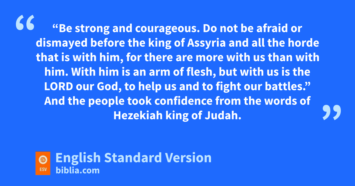 32 iAfter these things and these acts of faithfulness, Sennacherib king of Assyria came and invaded Judah and encamped against the fortified cities, thinking to win them for himself. 2 And when Hezekiah saw that Sennacherib had come and intended to fight against Jerusalem, 3 he planned with his officers and his mighty men to stop the water of the springs that were outside the city; and they helped him. 4 A great many people were gathered, and they stopped all the springs and jthe brook that flowed through the land, saying, “Why should the kings of Assyria come and find much water?” 5 He set to work resolutely and built up kall the wall that was broken down and raised towers upon it,1 and outside it he built another wall, and he strengthened the lMillo in the city of David. He also made weapons and shields in abundance. 6 And he set combat commanders over the people and gathered them together to him in the square at the gate of the city and spoke mencouragingly to them, saying, 7 n“Be strong and courageous. oDo not be afraid or dismayed before the king of Assyria and all the horde that is with him, pfor there are more with us than with him. 8 With him is qan arm of flesh, rbut with us is the Lord our God, to help us and to fight our battles.” And the people took confidence from the words of Hezekiah king of Judah.