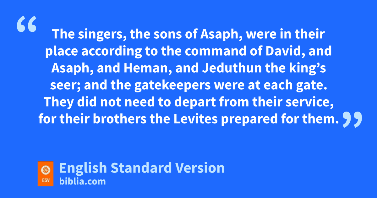 10 When the service had been prepared for, the priests sstood in their place, tand the Levites in their divisions according to the king’s command. 11 uAnd they slaughtered the Passover lamb, and the priests vthrew the blood that they received from them wwhile the Levites flayed the sacrifices. 12 And they set aside the burnt offerings that they might distribute them according to the groupings of the fathers’ houses of the lay people, to offer to the Lord, as it is written in the Book of Moses. And so they did with the bulls. 13 xAnd they roasted the Passover lamb with fire according to the rule; and they yboiled the holy offerings in pots, in cauldrons, and in pans, and carried them quickly to all the lay people. 14 And afterward they prepared for themselves and for the priests, because the priests, the sons of Aaron, were offering the burnt offerings and the fat parts until night; so the Levites prepared for themselves and for the priests, the sons of Aaron. 15 The singers, the sons of Asaph, were in their place zaccording to the command of David, and Asaph, and Heman, and Jeduthun the king’s aseer; band the gatekeepers were at each gate. They did not need to depart from their service, for their brothers the Levites prepared for them.