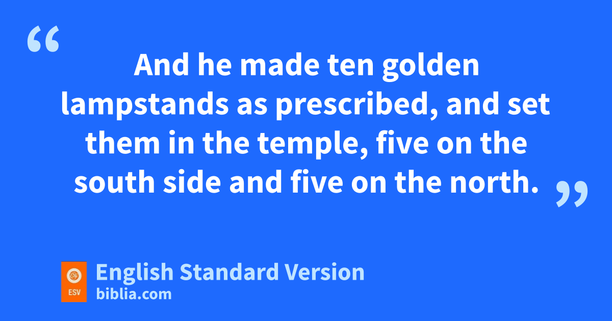 7 And he made ten golden lampstands oas prescribed, and set them in the temple, five on the south side and five on the north. 8 pHe also made ten tables and placed them in the temple, five on the south side and five on the north. And he made a hundred basins of gold. 9 He made qthe court of the priests rand the great court and doors for the court and overlaid their doors with bronze. 10 sAnd he set the sea at the southeast corner of the house.