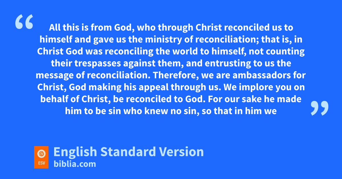 16 From now on, therefore, hwe regard no one according to the flesh. Even though we once regarded Christ according to the flesh, we regard him thus no longer. 17 Therefore, if anyone is iin Christ, he is ja new creation.2 kThe old has passed away; behold, the new has come. 18 All this is from God, lwho through Christ reconciled us to himself and gave us mthe ministry of reconciliation; 19 that is, in Christ God was reconciling3 the world to himself, nnot counting their trespasses against them, and entrusting to us mthe message of reconciliation. 20 Therefore, owe are ambassadors for Christ, pGod making his appeal through us. We implore you on behalf of Christ, be reconciled to God. 21 qFor our sake he made him to be sin rwho knew no sin, so that in him we might become sthe righteousness of God.