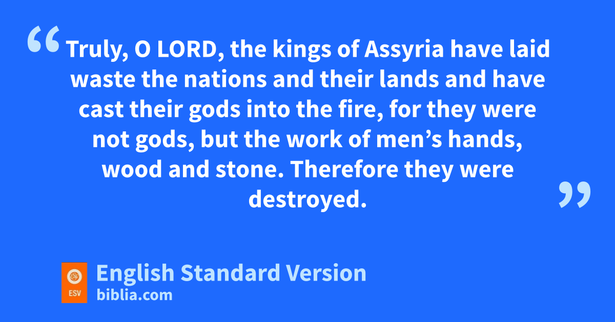14 Hezekiah received nthe letter from the hand of the messengers and read it; and Hezekiah went up to the house of the Lord and spread it before the Lord. 15 And Hezekiah prayed before the Lord and said: “O Lord, the God of Israel, oenthroned above the cherubim, pyou are the God, you alone, of all the kingdoms of the earth; you have made the heavens and the earth. 16 qIncline your ear, O Lord, and hear; ropen your eyes, O Lord, and see; and hear the words of Sennacherib, which he has sent sto mock the living God. 17 Truly, O Lord, the kings of Assyria have laid waste the nations and their lands 18 and have cast their gods into the fire, for they were not gods, tbut the work of men’s hands, wood and stone. Therefore they were destroyed. 19 So now, O Lord our God, save us, please, from his hand, uthat all the kingdoms of the earth may know that pyou, O Lord, are God alone.”