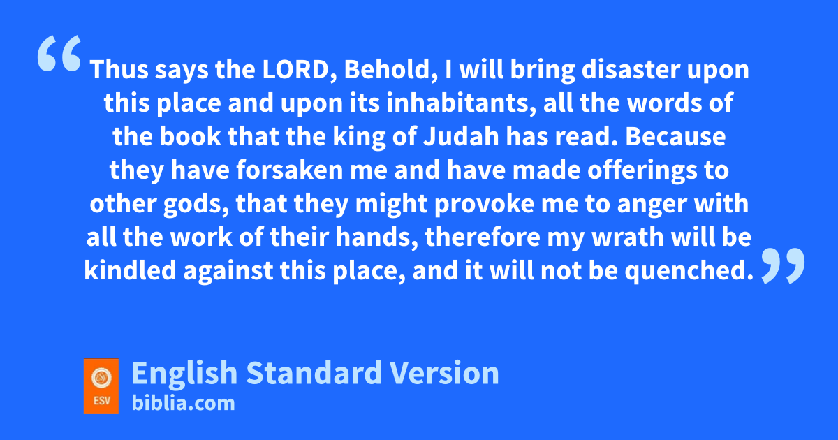 14 So Hilkiah the priest, and Ahikam, and Achbor, and Shaphan, and Asaiah went to Huldah the prophetess, the wife of Shallum the son of nTikvah, son of nHarhas, keeper of the wardrobe (now she lived in Jerusalem in othe Second Quarter), and they talked with her. 15 And she said to them, “Thus says the Lord, the God of Israel: ‘Tell the man who sent you to me, 16 Thus says the Lord, Behold, I will bring disaster upon this place and upon its inhabitants, all the words of the book that the king of Judah has read. 17 pBecause they have forsaken me and have made offerings to other gods, that they might provoke me to anger with all the work of their hands, therefore mmy wrath will be kindled against this place, and it will not be quenched. 18 But to the king of Judah, who sent you to inquire of the Lord, thus shall you say to him, Thus says the Lord, the God of Israel: Regarding the words that you have heard, 19 qbecause your heart was penitent, and you rhumbled yourself before the Lord, when you heard how I spoke against this place and against its inhabitants, that they should become sa desolation and ta curse, and you uhave torn your clothes and wept before me, I also have heard you, declares the Lord. 20 Therefore, behold, I will gather you to your fathers, and vyou shall be gathered to your grave in peace, and your eyes shall not see all the disaster that I will bring upon this place.’ ” And they brought back word to the king.