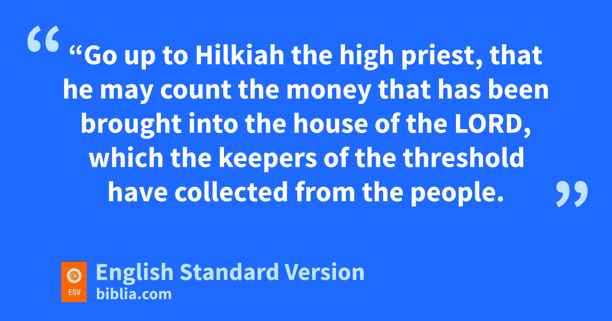 3 In the eighteenth year of King Josiah, the king sent Shaphan the son of Azaliah, son of Meshullam, the secretary, to the house of the Lord, saying, 4 “Go up to dHilkiah the high priest, that he may count the money ethat has been brought into the house of the Lord, which fthe keepers of the threshold have collected from the people. 5 gAnd let it be given into the hand of the workmen who have the oversight of the house of the Lord, and let them give it to the workmen who are at the house of the Lord, repairing the house 6 (that is, to the carpenters, and to the builders, and to the masons), and let them use it for buying timber and quarried stone to repair the house. 7 But hno accounting shall be asked from them for the money that is delivered into their hand, for they deal honestly.”