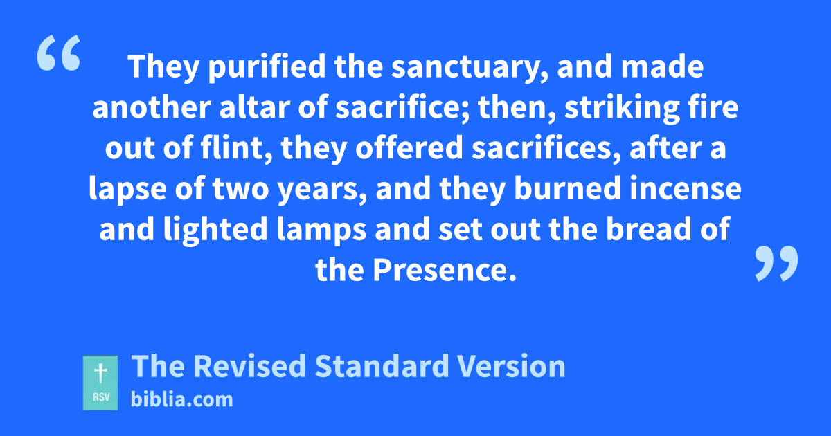1 Now Maccabeus and his followers, the Lord leading them on, recovered the temple and the city; 2 and they tore down the altars which had been built in the public square by the foreigners, and also destroyed the sacred precincts. 3 They purified the sanctuary, and made another altar of sacrifice; then, striking fire out of flint, they offered sacrifices, after a lapse of two years, and they burned incense and lighted lamps and set out the bread of the Presence. 4 And when they had done this, they fell prostrate and besought the Lord that they might never again fall into such misfortunes, but that, if they should ever sin, they might be disciplined by him with forbearance and not be handed over to blasphemous and barbarous nations. 5 It happened that on the same day on which the sanctuary had been profaned by the foreigners, the purification of the sanctuary took place, that is, on the twenty-fifth day of the same month, which was Chislev. 6 And they celebrated it for eight days with rejoicing, in the manner of the feast of booths, remembering how not long before, during the feast of booths, they had been wandering in the mountains and caves like wild animals. 7 Therefore bearing ivy-wreathed wands and beautiful branches and also fronds of palm, they offered hymns of thanksgiving to him who had given success to the purifying of his own holy place. 8 They decreed by public ordinance and vote that the whole nation of the Jews should observe these days every year.
