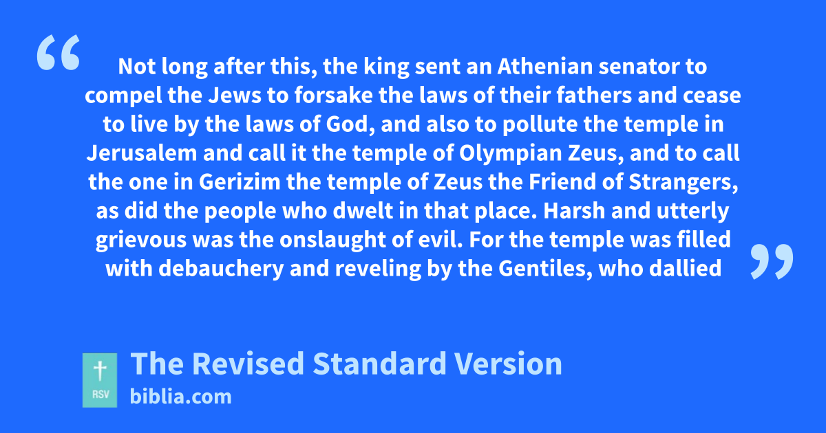 1 Not long after this, the king sent an Athenian senator to compel the Jews to forsake the laws of their fathers and cease to live by the laws of God, 2 and also to pollute the temple in Jerusalem and call it the temple of Olympian Zeus, and to call the one in Gerizim the temple of Zeus the Friend of Strangers, as did the people who dwelt in that place.