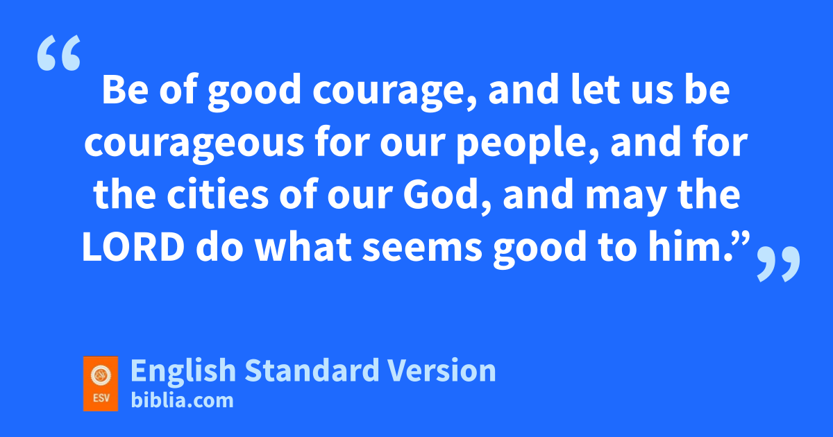 9 When Joab saw that the battle was set against him both in front and in the rear, he chose some of the best men of Israel and arrayed them against the Syrians. 10 The rest of his men he put in the charge of Abishai his brother, and he arrayed them against the Ammonites. 11 And he said, “If the Syrians are too strong for me, then you shall help me, but if the Ammonites are too strong for you, then I will come and help you. 12 aBe of good courage, and blet us be courageous for our people, and for the cities of our God, and cmay the Lord do what seems good to him.” 13 So Joab and the people who were with him drew near to battle against the Syrians, and they fled before him. 14 And when the Ammonites saw that the Syrians fled, they likewise fled before Abishai and entered the city. Then Joab returned from fighting against the Ammonites and came to Jerusalem.