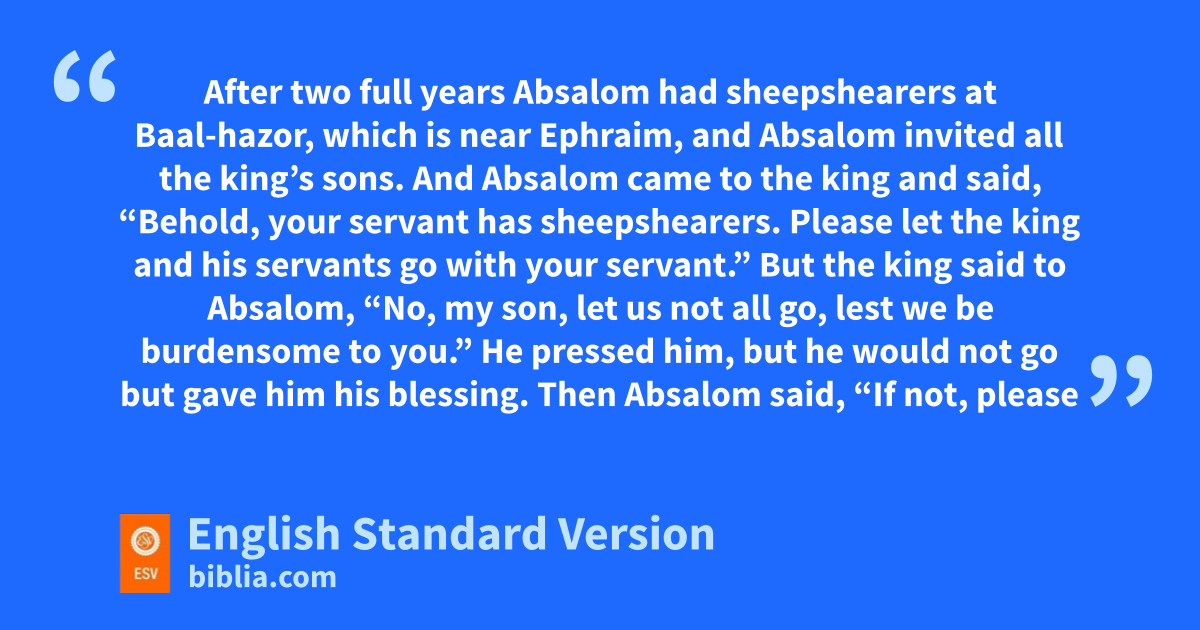 23 After two full years Absalom had jsheepshearers at Baal-hazor, which is near Ephraim, and Absalom invited all the king’s sons. 24 And Absalom came to the king and said, “Behold, your servant has sheepshearers. Please let the king and his servants go with your servant.” 25 But the king said to Absalom, “No, my son, let us not all go, lest we be burdensome to you.” He pressed him, but he would not go but gave him his blessing. 26 Then Absalom said, “If not, please let my brother Amnon go with us.” And the king said to him, “Why should he go with you?” 27 But Absalom pressed him until he let Amnon and all the king’s sons go with him. 28 Then Absalom commanded his servants, “Mark when Amnon’s kheart is merry with wine, and when I say to you, ‘Strike Amnon,’ then kill him. Do not fear; have I not commanded you? Be courageous and be valiant.” 29 So the servants of Absalom did to Amnon as Absalom had commanded. Then all the king’s sons arose, and each mounted his mule and fled.