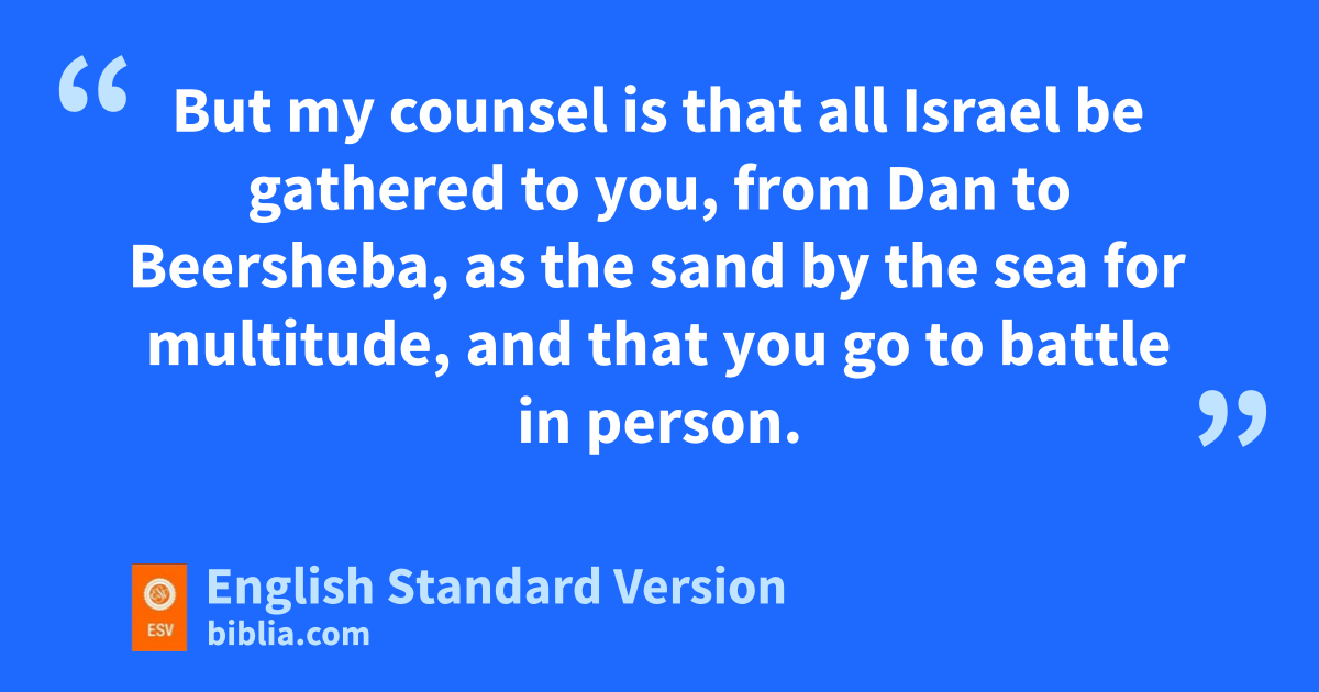 5 Then Absalom said, “Call sHushai the Archite also, and let us hear what he has to say.” 6 And when Hushai came to Absalom, Absalom said to him, “Thus has Ahithophel spoken; shall we do as he says? If not, you speak.” 7 Then Hushai said to Absalom, “This time the counsel that Ahithophel has given is not good.” 8 Hushai said, “You know that your father and his men are mighty men, and that they are enraged,2 tlike a bear robbed of her cubs in the field. Besides, your father is expert in war; he will not spend the night with the people. 9 Behold, even now he has hidden himself in one of the pits or in some other place. And as soon as some of the people fall3 at the first attack, whoever hears it will say, ‘There has been a slaughter among the people who follow Absalom.’ 10 Then even the valiant man, whose heart is like the heart of a lion, will utterly umelt with fear, for all Israel knows that your father is a mighty man, and that those who are with him are valiant men. 11 But my counsel is that all Israel be gathered to you, vfrom Dan to Beersheba, was the sand by the sea for multitude, and that you go to battle in person. 12 So we shall come upon him in some place where he is to be found, and we shall light upon him as the dew falls on the ground, and of him and all the men with him not one will be left. 13 If he withdraws into a city, then all Israel will bring ropes to that city, and we shall drag it into the valley, until not even a pebble is to be found there.” 14 And Absalom and all the men of Israel said, “The counsel of Hushai the Archite is better than the counsel of Ahithophel.” xFor the Lord had ordained4 to defeat the good counsel of Ahithophel, so that the Lord might bring harm upon Absalom.