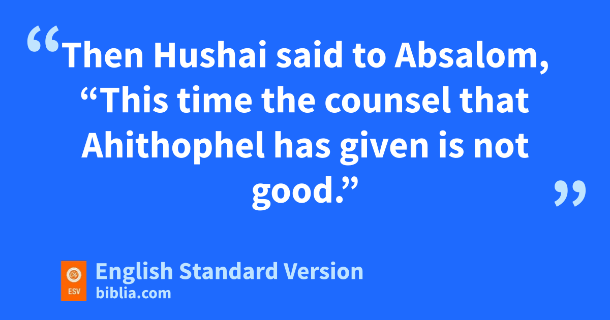 5 Then Absalom said, “Call sHushai the Archite also, and let us hear what he has to say.” 6 And when Hushai came to Absalom, Absalom said to him, “Thus has Ahithophel spoken; shall we do as he says? If not, you speak.” 7 Then Hushai said to Absalom, “This time the counsel that Ahithophel has given is not good.” 8 Hushai said, “You know that your father and his men are mighty men, and that they are enraged,2 tlike a bear robbed of her cubs in the field. Besides, your father is expert in war; he will not spend the night with the people. 9 Behold, even now he has hidden himself in one of the pits or in some other place. And as soon as some of the people fall3 at the first attack, whoever hears it will say, ‘There has been a slaughter among the people who follow Absalom.’ 10 Then even the valiant man, whose heart is like the heart of a lion, will utterly umelt with fear, for all Israel knows that your father is a mighty man, and that those who are with him are valiant men. 11 But my counsel is that all Israel be gathered to you, vfrom Dan to Beersheba, was the sand by the sea for multitude, and that you go to battle in person. 12 So we shall come upon him in some place where he is to be found, and we shall light upon him as the dew falls on the ground, and of him and all the men with him not one will be left. 13 If he withdraws into a city, then all Israel will bring ropes to that city, and we shall drag it into the valley, until not even a pebble is to be found there.” 14 And Absalom and all the men of Israel said, “The counsel of Hushai the Archite is better than the counsel of Ahithophel.” xFor the Lord had ordained4 to defeat the good counsel of Ahithophel, so that the Lord might bring harm upon Absalom.