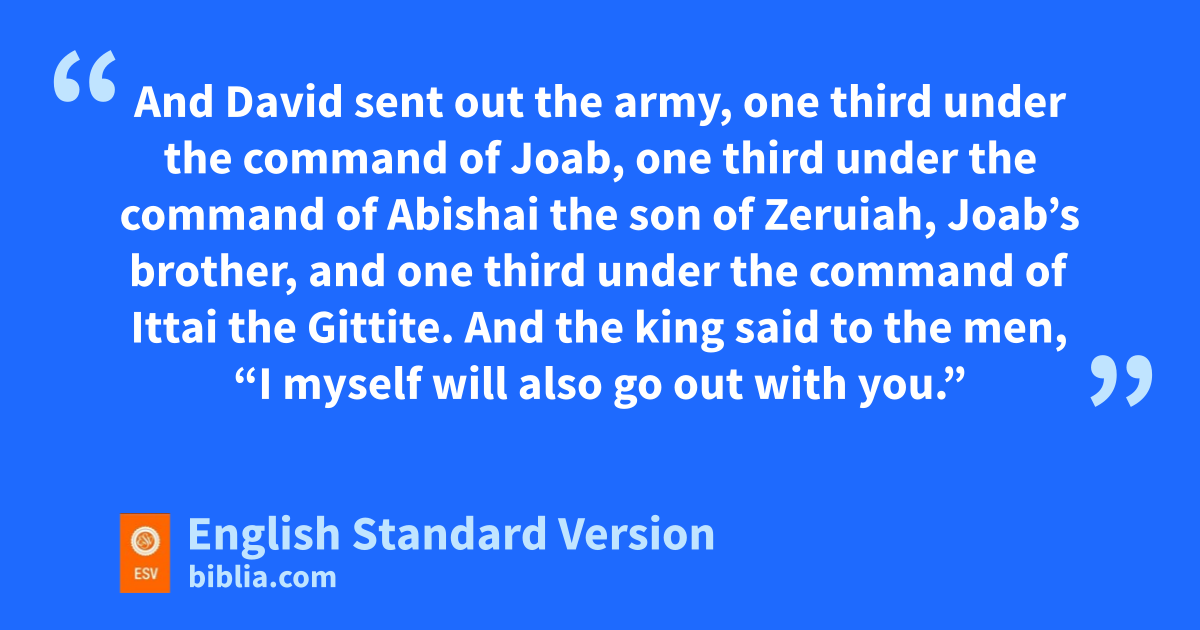 18 Then David mustered the men who were with him and set over them commanders of thousands and commanders of hundreds. 2 And David sent out the army, one third under the command of Joab, one third under the command of Abishai the son of Zeruiah, Joab’s brother, and one third under the command of sIttai the Gittite. And the king said to the men, “I myself will also go out with you.” 3 tBut the men said, “You shall not go out. For if we flee, they will not care about us. If half of us die, they will not care about us. But you are worth ten thousand of us. Therefore it is better that you send us help from the city.” 4 The king said to them, “Whatever seems best to you I will do.” So the king stood at the side of the gate, while all the army marched out by hundreds and by thousands. 5 And the king ordered Joab and Abishai and Ittai, “Deal gently for my sake with the young man Absalom.” uAnd all the people heard when the king gave orders to all the commanders about Absalom.