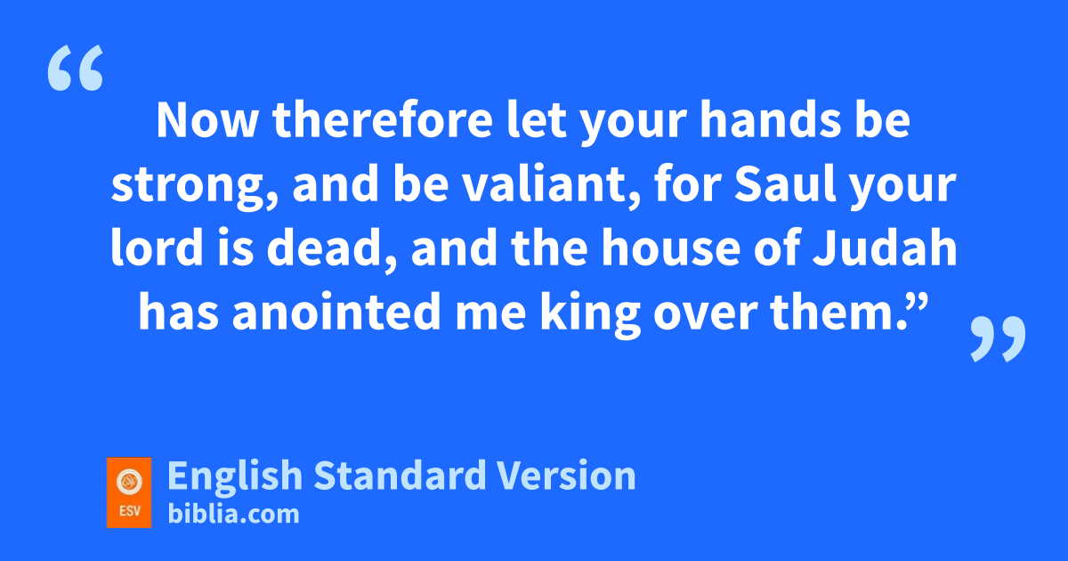 When they told David, j“It was the men of Jabesh-gilead who buried Saul,” 5 David sent messengers to the men of Jabesh-gilead and said to them, k“May you be blessed by the Lord, because you showed this loyalty to Saul your lord and buried him. 6 Now may the Lord show steadfast love and faithfulness to you. And I will do good to you because you have done this thing. 7 Now therefore let your hands be strong, and be valiant, for Saul your lord is dead, and ithe house of Judah has anointed me king over them.”