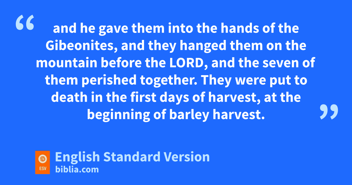 21 Now there was a famine in the days of David for three years, year after year. And David zsought the face of the Lord. And the Lord said, “There is bloodguilt on Saul and on his house, because he put the Gibeonites to death.” 2 So the king called the Gibeonites and spoke to them. Now the Gibeonites were not of the people of Israel but aof the remnant of the Amorites. Although the people of Israel had sworn to spare them, Saul had sought to strike them down in his zeal for the people of Israel and Judah. 3 And David said to the Gibeonites, “What shall I do for you? And how shall I make atonement, that you may bless bthe heritage of the Lord?” 4 The Gibeonites said to him, “It is not a matter of silver or gold between us and Saul or his house; neither is it for us to put any man to death in Israel.” And he said, “What do you say that I shall do for you?” 5 They said to the king, “The man who consumed us and planned to destroy us, so that we should have no place in all the territory of Israel, 6 let seven of his sons be given to us, so that we may hang them before the Lord at cGibeah of Saul, dthe chosen of the Lord.” And the king said, “I will give them.”