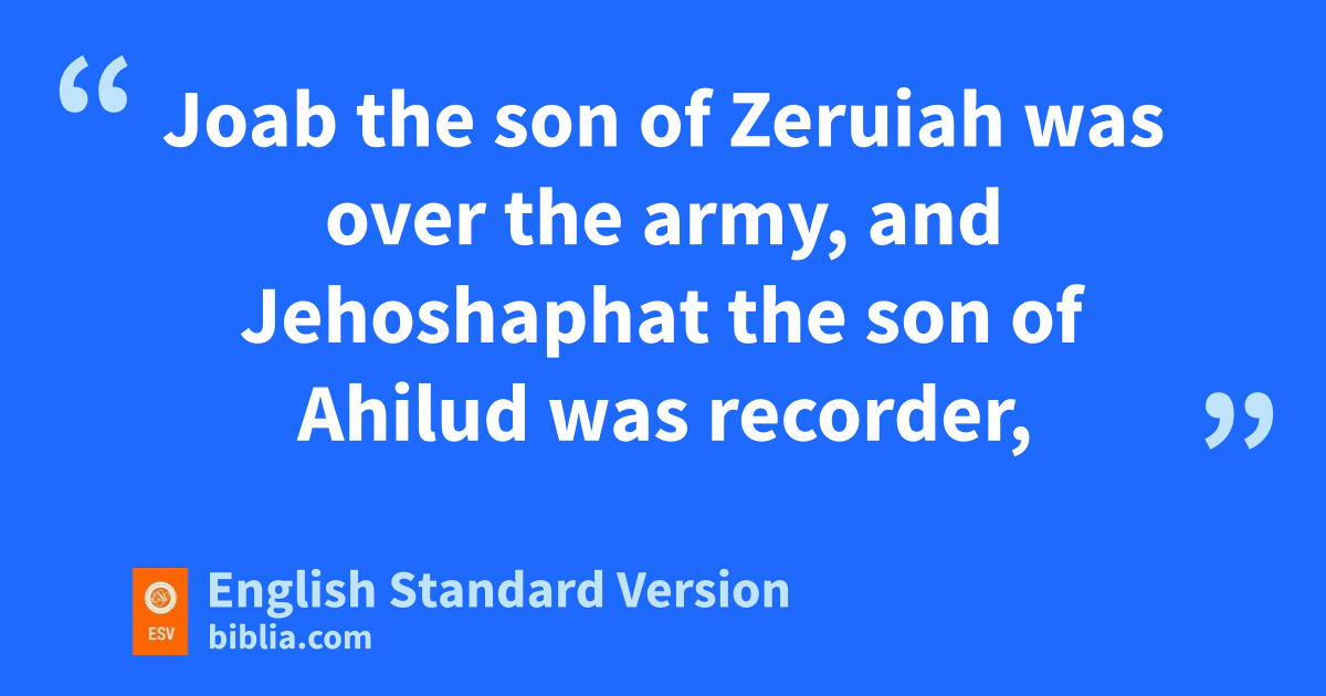 15 So David reigned over all Israel. And David administered justice and equity to all his people. 16 cJoab the son of Zeruiah was over the army, and dJehoshaphat the son of Ahilud was recorder, 17 and eZadok the son of Ahitub and Ahimelech the son of Abiathar were priests, and fSeraiah was secretary, 18 and gBenaiah the son of Jehoiada was over1 the hCherethites and the Pelethites, and David’s sons were priests.