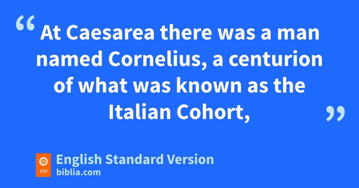 10 At Caesarea there was a man named Cornelius, a centurion of wwhat was known as the Italian Cohort, 2 a devout man xwho feared God with all his household, gave alms generously to the people, and prayed continually to God. 3 yAbout the ninth hour of the day1 zhe saw clearly in a vision aan angel of God come in and say to him, “Cornelius.” 4 And he stared at him in terror and said, “What is it, Lord?” And he said to him, “Your prayers and your alms bhave ascended cas a memorial before God. 5 And now send men to Joppa and bring one Simon who is called Peter. 6 He is lodging dwith one Simon, a tanner, whose house is by the sea.” 7 When the angel who spoke to him had departed, he called two of his servants and a devout soldier from among those who attended him, 8 and having related everything to them, he sent them to Joppa.