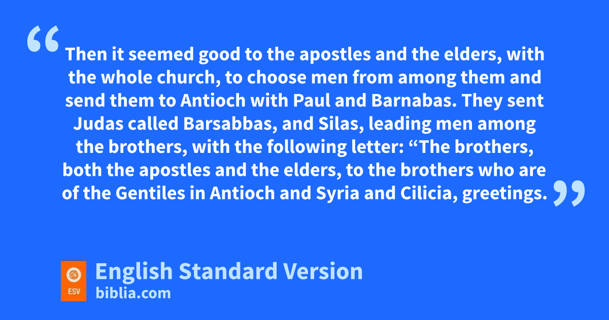 22 Then it seemed good to uthe apostles and the elders, with the whole church, to choose men from among them and send them to Antioch with Paul and Barnabas. They sent Judas called vBarsabbas, and wSilas, leading men among xthe brothers, 23 with the following letter: x“The brothers, both uthe apostles and the elders, to the brothers3 who are of the Gentiles in Antioch and Syria and Cilicia, ygreetings. 24 Since we have heard that zsome persons have gone out from us and atroubled you4 with words, unsettling your minds, although we gave them no instructions, 25 it has seemed good to us, having come bto one accord, to choose men and send them to you with our cbeloved Barnabas and Paul, 26 dmen who have erisked their lives for the name of our Lord Jesus Christ. 27 We have therefore sent fJudas and Silas, who themselves will tell you the same things by word of mouth. 28 For it has seemed good gto the Holy Spirit and hto us ito lay on you no greater burden than these requirements: 29 jthat you abstain from kwhat has been sacrificed to idols, and from blood, and from what has been strangled, and from sexual immorality. If you keep yourselves from these, you will do well. Farewell.”
