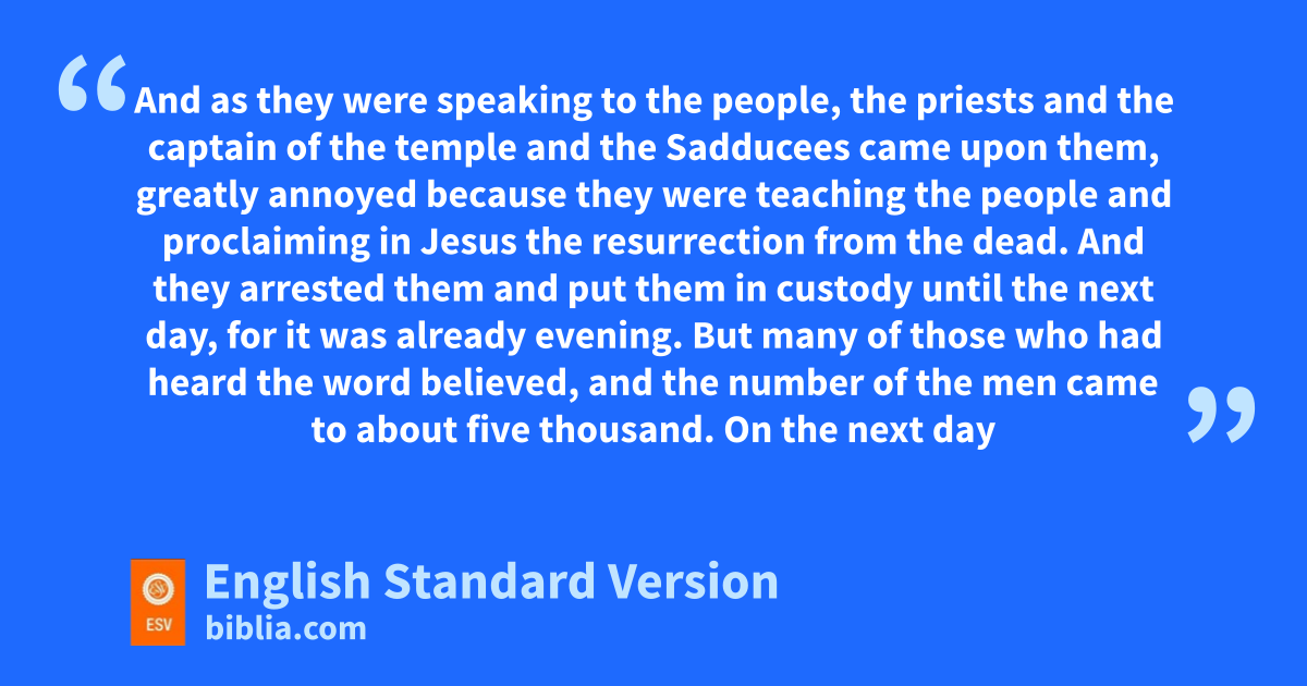 4 And as they were speaking to the people, the priests and lthe captain of the temple and mthe Sadducees came upon them, 2 greatly annoyed because they were teaching the people and proclaiming nin Jesus the resurrection from the dead. 3 And they arrested them and oput them in custody until the next day, for it was already evening. 4 But many of those who had heard the word believed, and pthe number of the men came to about five thousand.