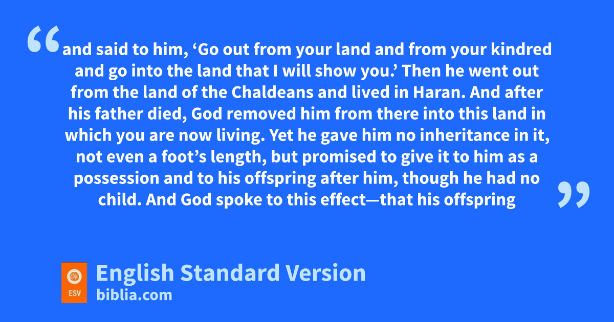 j“Brothers and fathers, hear me. kThe God lof glory appeared to our father Abraham when he was in Mesopotamia, mbefore he lived in Haran, 3 and said to him, n‘Go out from your land and from your kindred and go into the land that I will show you.’ 4 mThen he went out from the land of the Chaldeans and lived in Haran. And oafter his father died, pGod removed him from there into this land in which you are now living. 5 Yet he gave him no inheritance in it, not even a foot’s length, but promised qto give it to him as a possession and to his offspring after him, rthough he had no child. 6 And God spoke to this effect—that shis offspring would tbe sojourners in a land belonging to others, who would enslave them and afflict them ufour hundred years. 7 ‘But vI will judge the nation that they serve,’ said God, ‘and after that they shall come out wand worship me in this place.’ 8 And xhe gave him the covenant of circumcision. And yso Abraham became the father of Isaac, and zcircumcised him on the eighth day, and aIsaac became the father of Jacob, and bJacob of the twelve patriarchs.
