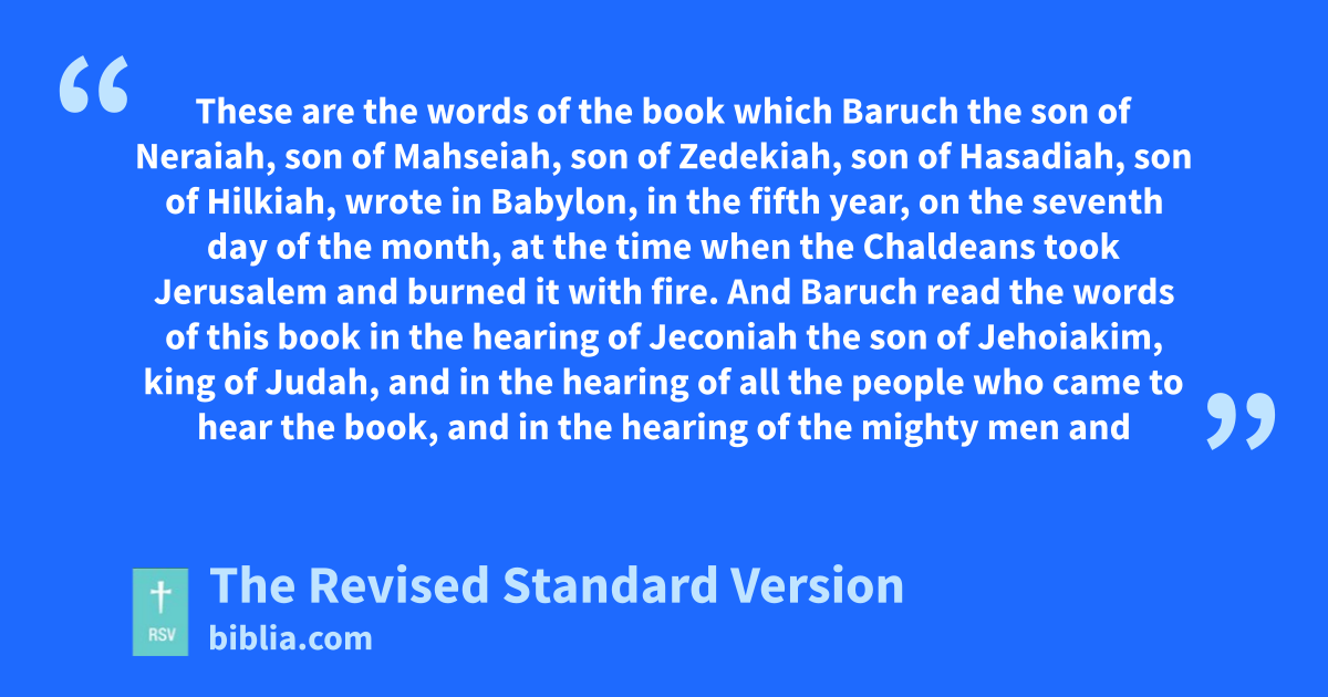 1 These are the words of the book which Baruch the son of Neraiah, son of Mahseiah, son of Zedekiah, son of Hasadiah, son of Hilkiah, wrote in Babylon, 2 in the fifth year, on the seventh day of the month, at the time when the Chaldeans took Jerusalem and burned it with fire. 3 And Baruch read the words of this book in the hearing of Jeconiah the son of Jehoiakim, king of Judah, and in the hearing of all the people who came to hear the book, 4 and in the hearing of the mighty men and the princes, and in the hearing of the elders, and in the hearing of all the people, small and great, all who dwelt in Babylon by the river Sud.