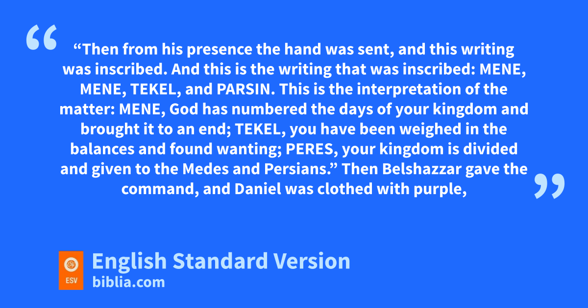 24 “Then from his presence ithe hand was sent, and this writing was inscribed. 25 And this is the writing that was inscribed: Mene, Mene, Tekel, and Parsin. 26 This is the interpretation of the matter: Mene, God has numbered7 the days of your kingdom and brought it to an end; 27 Tekel, jyou have been weighed8 in the balances and found wanting; 28 Peres, your kingdom is divided and given to kthe Medes and lPersians.”9