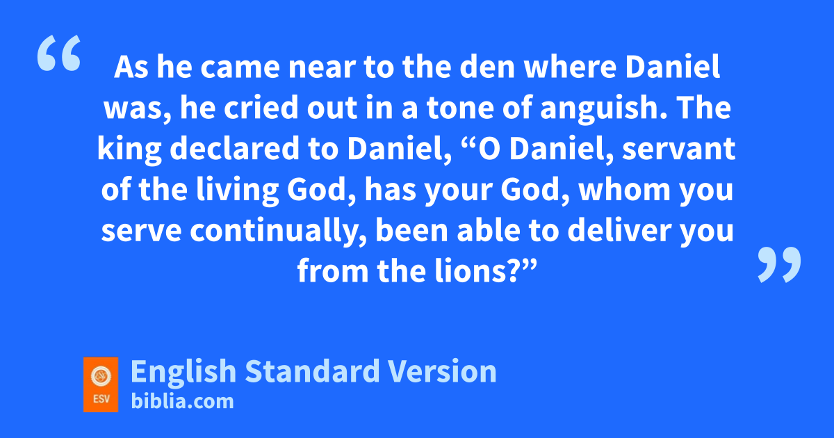 19 Then, at break of day, the king arose and went in haste to the den of lions. 20 As he came near to the den where Daniel was, he cried out in a tone of anguish. The king declared to Daniel, “O Daniel, servant of vthe living God, ohas your God, whom you serve continually, wbeen able to deliver you from the lions?” 21 Then Daniel said to the king, x“O king, live forever! 22 My God ysent his angel zand shut the lions’ mouths, and they have not harmed me, because I was found blameless abefore him; aand also before you, O king, I have done no harm.” 23 Then the king was exceedingly glad, and commanded that Daniel be taken up out of the den. So Daniel was taken up out of the den, and bno kind of harm was found on him, because he had trusted in his God. 24 And the king commanded, and cthose men who had maliciously accused Daniel were brought and cast into the den of lions—they, their children, and their wives. And before they reached the bottom of the den, the lions overpowered them and broke all their bones in pieces.