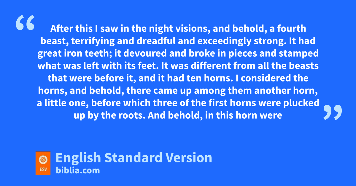 7 In the first year of pBelshazzar king of Babylon, qDaniel saw a dream and rvisions of his head as he lay in his bed. Then he wrote down the dream and told the sum of the matter. 2 Daniel declared,1 “I saw in my vision by night, and behold, sthe four winds of heaven were stirring up the great sea. 3 And four great beasts tcame up out of the sea, different from one another. 4 The first was like a lion and had eagles’ wings. Then as I looked its wings were plucked off, and it was lifted up from the ground and made to stand on two feet like a man, and the mind of a man was given to it. 5 And behold, uanother beast, a second one, like a bear. It was raised up on one side. It had three ribs in its mouth between its teeth; and it was told, ‘Arise, devour much flesh.’ 6 After this I looked, and behold, another, like a vleopard, with four wings of a bird on its back. And the beast had four heads, and wdominion was given to it. 7 After this I saw in the night visions, and behold, a fourth beast, xterrifying and dreadful and exceedingly strong. It had great iron teeth; xit devoured and broke in pieces xand stamped what was left with its feet. It was different from all the beasts that were before it, and yit had ten horns. 8 I considered the horns, and behold, zthere came up among them another horn, a little one, zbefore which three of the first horns were plucked up by the roots. And behold, in this horn were eyes like the eyes of a man, and aa mouth speaking great things.