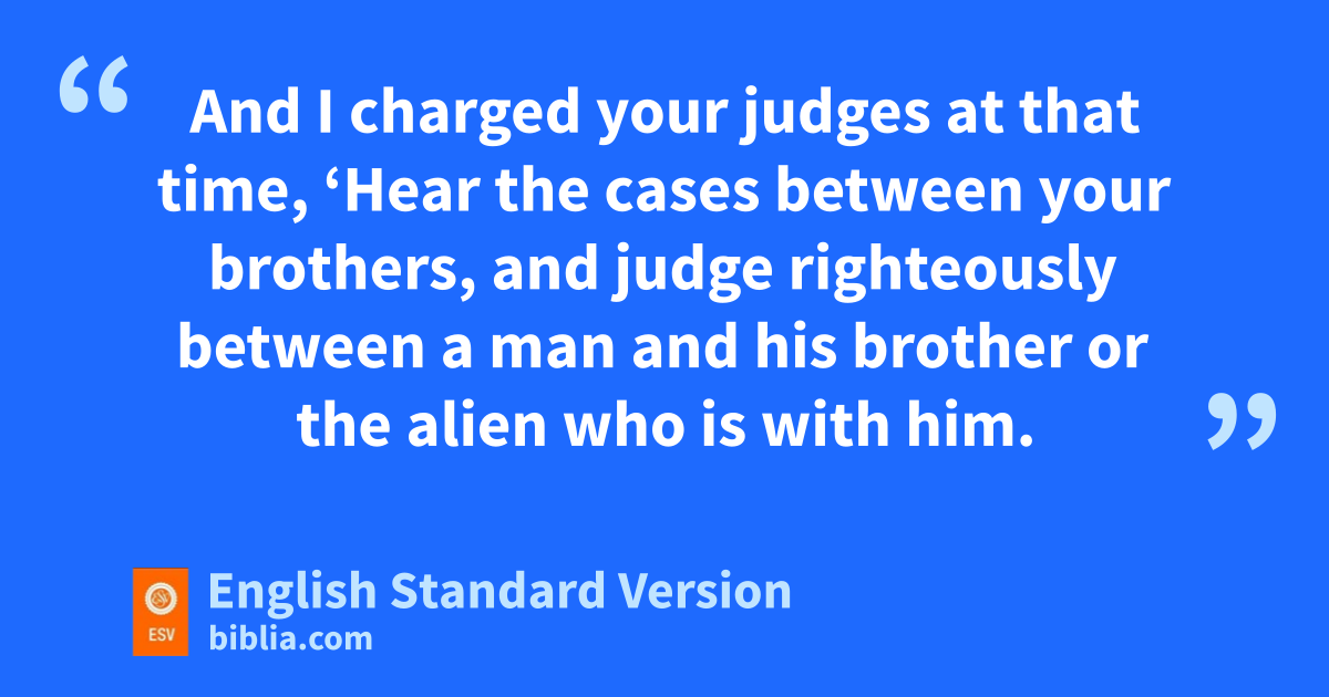 9 “At that time nI said to you, ‘I am not able to bear you by myself. 10 The Lord your God has multiplied you, and behold, oyou are today as numerous as the stars of heaven. 11 pMay the Lord, the God of your fathers, make you a thousand times as many as you are and bless you, qas he has promised you! 12 rHow can I bear by myself the weight and burden of you and your strife? 13 sChoose for your tribes wise, understanding, and experienced men, and I will appoint them as your heads.’ 14 And you answered me, ‘The thing that you have spoken is good for us to do.’ 15 So I took the heads of your tribes, wise and experienced men, tand set them as heads over you, commanders of thousands, commanders of hundreds, commanders of fifties, commanders of tens, and officers, throughout your tribes. 16 And I charged your judges at that time, ‘Hear the cases between your brothers, and ujudge righteously between a man and his brother or the alien who is with him. 17 vYou shall not be partial in judgment. You shall hear the small and the great alike. You shall not be intimidated by anyone, for wthe judgment is God’s. And the case that is too hard for you, you shall xbring to me, and I will hear it.’ 18 And I commanded you at that time all the things that you should do.