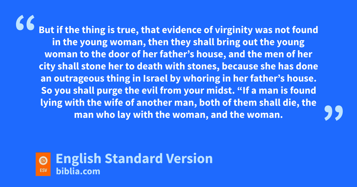 13 “If any man takes a wife and zgoes in to her and then hates her 14 and accuses her of misconduct and brings a bad name upon her, saying, ‘I took this woman, and when I came near her, I did not find in her evidence of virginity,’ 15 then the father of the young woman and her mother shall take and bring out the evidence of her virginity to the elders of the city in the gate. 16 And the father of the young woman shall say to the elders, ‘I gave my daughter to this man to marry, and he hates her; 17 and behold, he has accused her of misconduct, saying, “I did not find in your daughter evidence of virginity.” And yet this is the evidence of my daughter’s virginity.’ And they shall spread the cloak before the elders of the city. 18 Then the elders of that city shall take the man and whip2 him, 19 and they shall fine him a hundred shekels3 of silver and give them to the father of the young woman, because he has brought a bad name upon a virgin4 of Israel. And she shall be his wife. aHe may not divorce her all his days. 20 But if the thing is true, that evidence of virginity was not found in the young woman, 21 then they shall bring out the young woman to the door of her father’s house, and bthe men of her city shall stone her to death with stones, because she has cdone an outrageous thing in Israel by whoring in her father’s house. dSo you shall purge the evil from your midst.