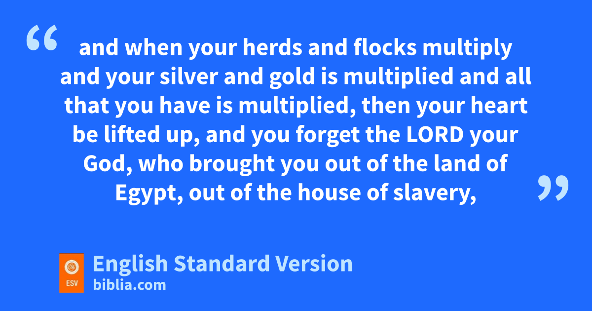11 “Take care lest you forget the Lord your God by not keeping his commandments and his rules and his statutes, which I command you today, 12 hlest, when you have eaten and are full and have built good houses and live in them, 13 and when your herds and flocks multiply and your silver and gold is multiplied and all that you have is multiplied, 14 ithen your heart be lifted up, and you jforget the Lord your God, who brought you out of the land of Egypt, out of the house of slavery, 15 who kled you through the great and terrifying wilderness, lwith its fiery serpents and scorpions mand thirsty ground where there was no water, nwho brought you water out of the flinty rock, 16 who fed you in the wilderness with omanna that your fathers did not know, that he might humble you and test you, pto do you good in the end. 17 Beware qlest you say in your heart, ‘My power and the might of my hand have gotten me this wealth.’ 18 You shall remember the Lord your God, for rit is he who gives you power to get wealth, sthat he may confirm his covenant that he swore to your fathers, as it is this day. 19 And if you forget the Lord your God and go after other gods and serve them and worship them, tI solemnly warn you today that you shall surely perish. 20 Like the nations that the Lord makes to perish before you, uso shall you perish, because you would not obey the voice of the Lord your God.