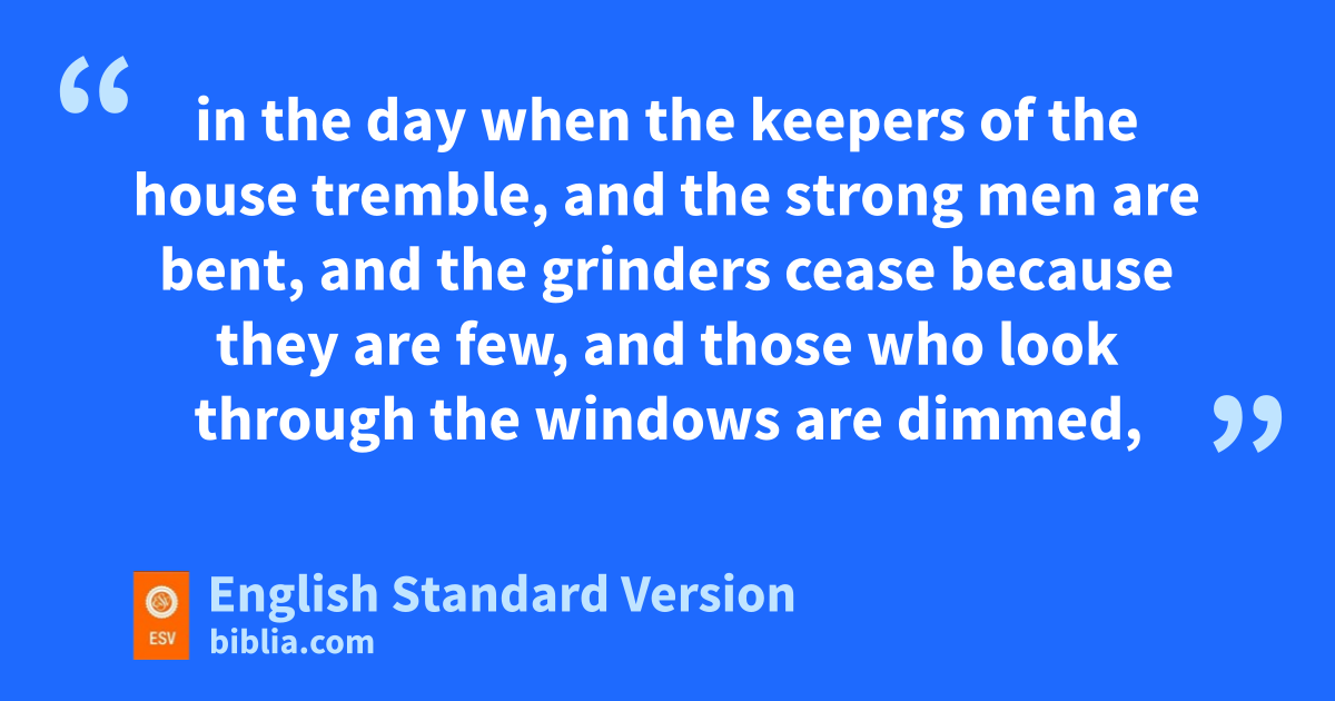 12 Remember also your Creator in vthe days of your youth, before wthe evil days come and the years draw near of which xyou will say, “I have no pleasure in them”; 2 before ythe sun and the light and the moon and the stars are darkened and the clouds return after the rain, 3 in the day when the keepers of the house tremble, and the strong men are bent, and the grinders cease because they are few, and zthose who look through the windows are dimmed, 4 and athe doors on the street are shut—when bthe sound of the grinding is low, and one rises up at the sound of a bird, and all cthe daughters of song are brought low— 5 they are afraid also of what is high, and dterrors are in the way; the almond tree blossoms, the grasshopper drags itself along,1 and desire fails, because man is going to his eeternal fhome, and the gmourners go about the streets— 6 before the silver cord is snapped, or hthe golden bowl is broken, or the pitcher is ishattered at the fountain, or the wheel broken at the cistern, 7 and jthe dust returns to the earth as it was, and kthe spirit returns to God lwho gave it. 8 mVanity2 of vanities, says nthe Preacher; all is vanity.