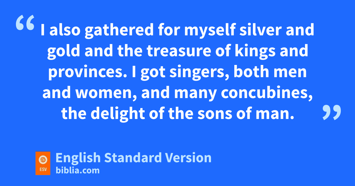 2 I xsaid in my heart, “Come now, I will test you with pleasure; enjoy yourself.” But behold, this also was vanity.1 2 I ysaid of laughter, “It is mad,” and of pleasure, “What use is it?” 3 I zsearched with my heart how to cheer my body with wine—my heart still guiding me with wisdom—and how to lay hold on afolly, till I might see what was good for the children of man to do under heaven during the few days of their life. 4 I made great works. I bbuilt houses and planted cvineyards for myself. 5 I made myself dgardens and parks, and planted in them all kinds of fruit trees. 6 I made myself pools from which to water the forest of growing trees. 7 I bought male and female slaves, and had eslaves who were born in my house. I had also great possessions of fherds and flocks, more than any who had been before me in Jerusalem. 8 I also gathered for myself silver and ggold and the treasure of hkings and iprovinces. I got jsingers, both men and women, and many kconcubines,2 the delight of the sons of man.