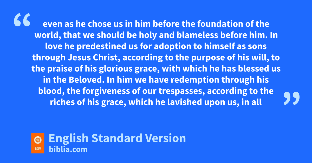 3 eBlessed be fthe God and Father of our Lord Jesus Christ, who has blessed us in Christ with every spiritual blessing gin the heavenly places, 4 heven as he ichose us in him jbefore the foundation of the world, that we should be kholy and blameless before him. In love 5 lhe predestined us2 for madoption to himself as sons through Jesus Christ, naccording to the purpose of his will, 6 oto the praise of his glorious grace, with which he has blessed us in pthe Beloved. 7 qIn him we have rredemption sthrough his blood, tthe forgiveness of our trespasses, uaccording to the riches of his grace, 8 which he lavished upon us, in all wisdom and insight 9 vmaking known3 to us the mystery of his will, naccording to his purpose, which he wset forth in Christ4 10 as a plan for xthe fullness of time, yto unite all things in Christ, things in heaven and things on earth in him.